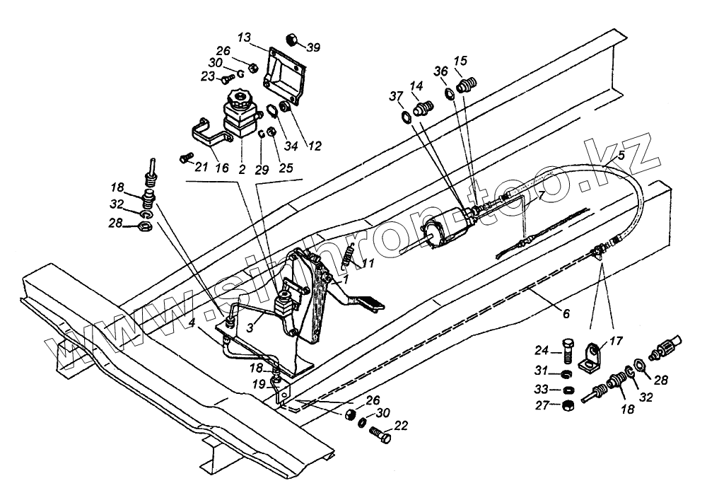 Каталог запасных частей к технике: Камский автозавод 65226. Установка педали и привода выключения сцепления