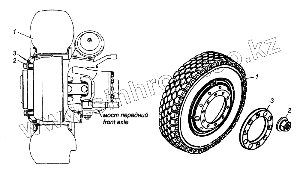 Каталог запасных частей к технике: Камский автозавод 65226. Установка передних колес