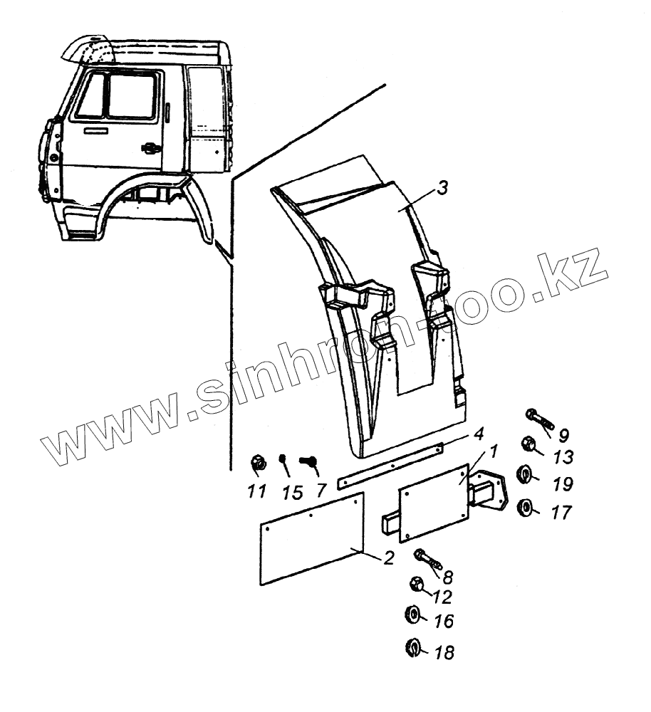 Каталог запасных частей к технике: Камский автозавод 65226. Установка задней части переднего крыла правая, левая