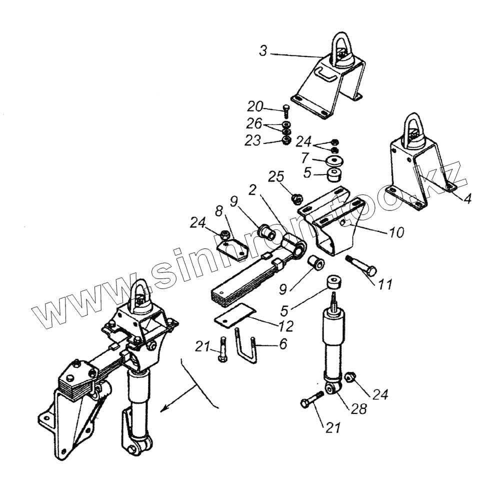 Каталог запасных частей к технике: Камский автозавод 65226. Установка задней подвески кабины