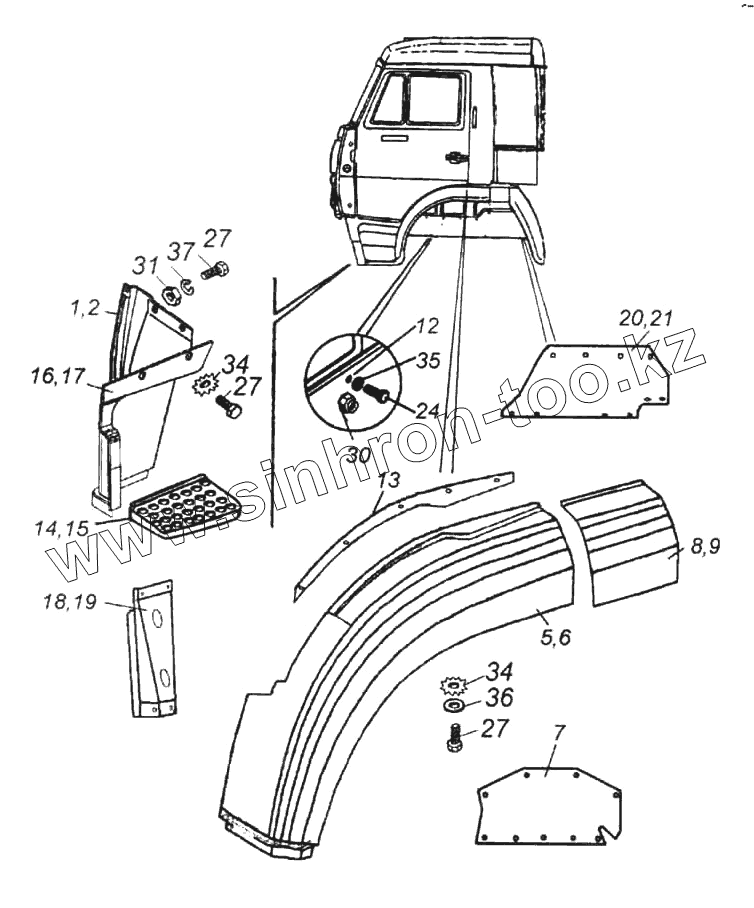 Каталог запасных частей к технике: Камский автозавод 6522. Установка оперения кабины