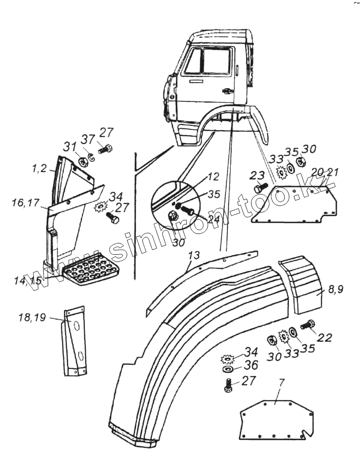 Каталог запасных частей к технике: Камский автозавод 6522. Установка оперения кабины