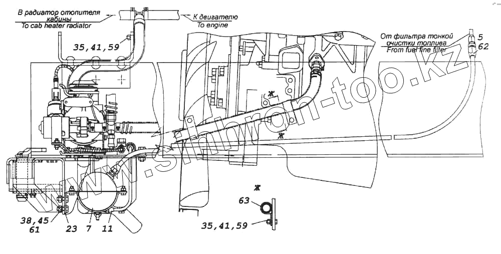Каталог запасных частей к технике: Камский автозавод 6522. Установка подогревателя 14ТС-10