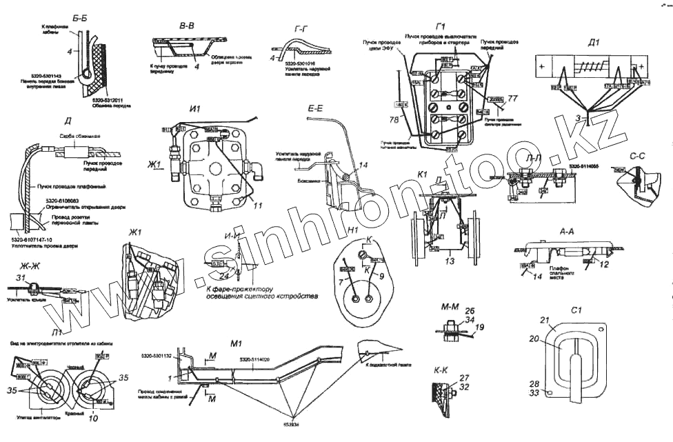 Каталог запасных частей к технике: Камский автозавод 6522. Установка проводов на кабине