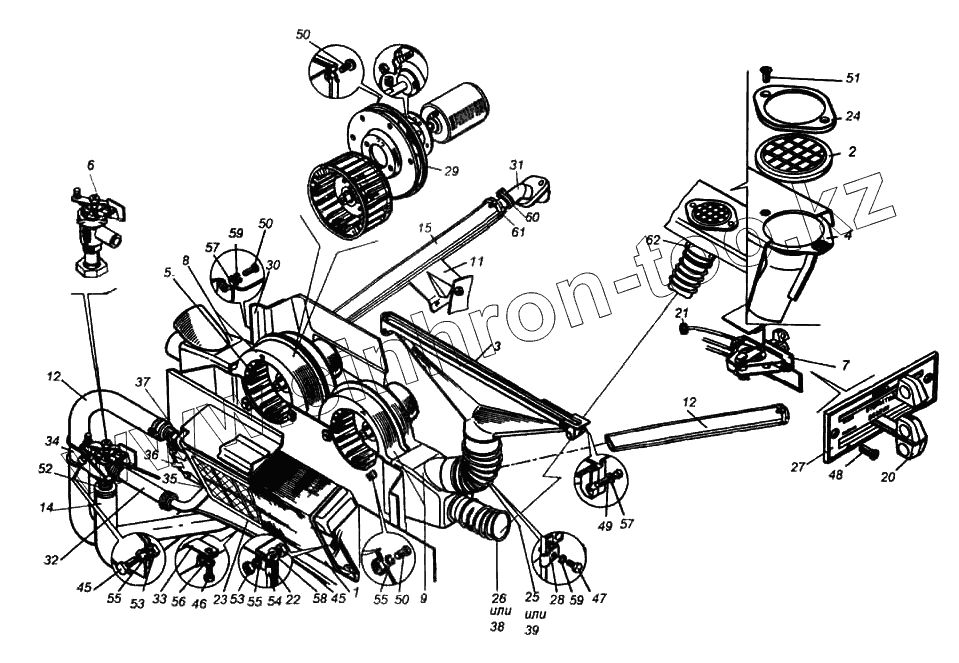 Каталог запасных частей к технике: Камский автозавод 6522. Установка системы отопления кабины