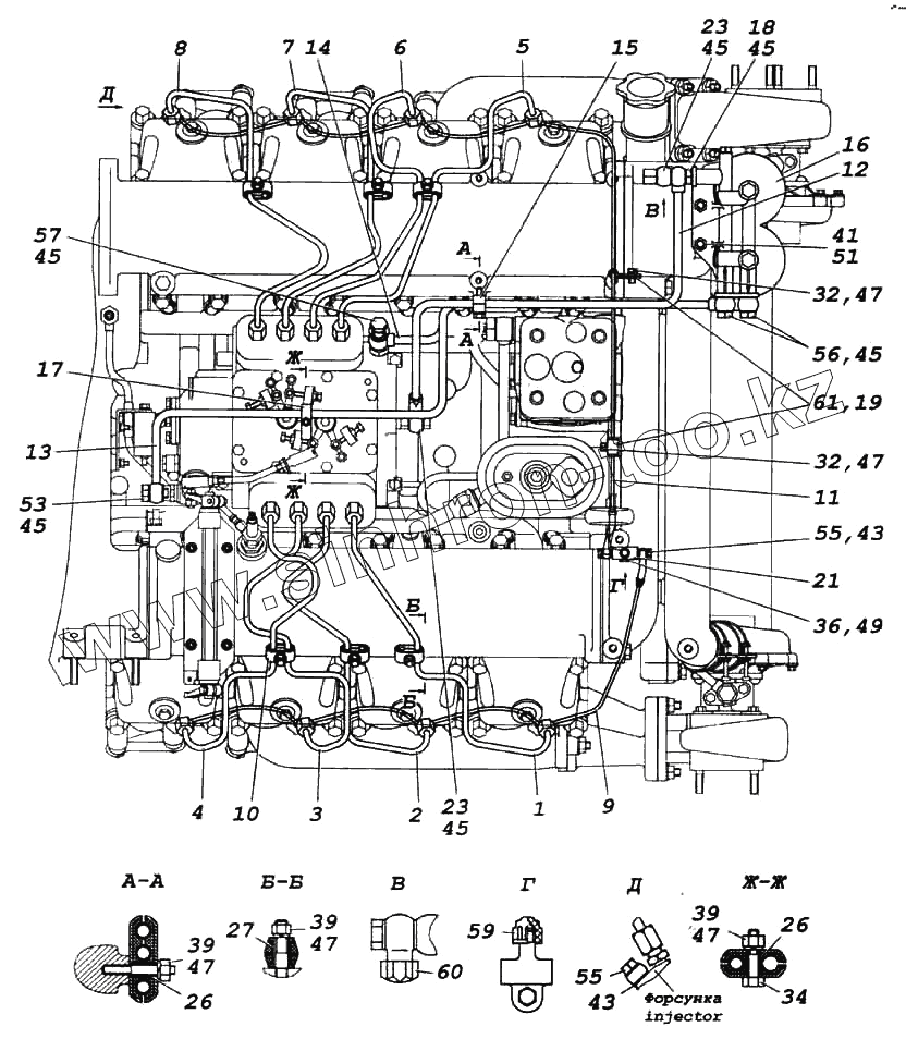 Каталог запасных частей к технике: Камский автозавод 6522. Установка топлипроводов