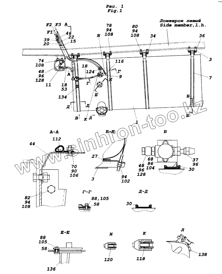 Каталог запасных частей к технике: Камский автозавод 6522. Установка топливных баков, ФГОТ и топлипроводов