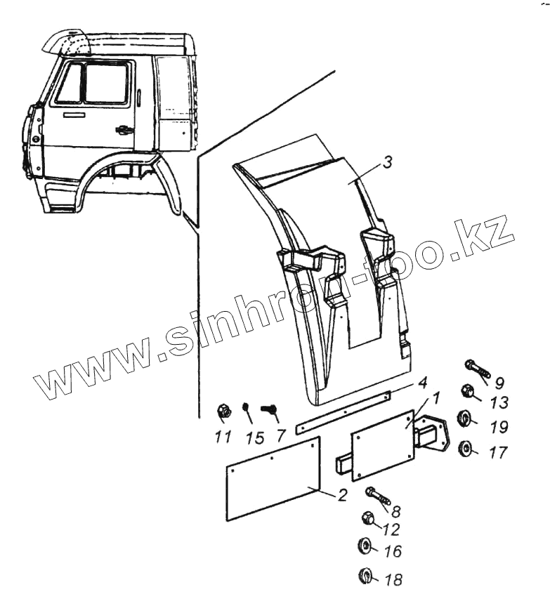 Каталог запасных частей к технике: Камский автозавод 6522. Установка задней части переднего крыла правая/левая