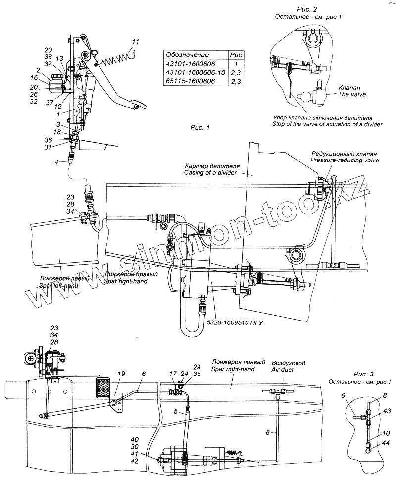 Каталог запасных частей к технике: Камский автозавод 6540. Установка педали и привода выключения сцепления