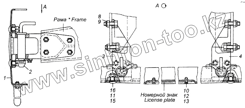 Каталог запасных частей к технике: Камский автозавод 6540. Установка переднего буфера