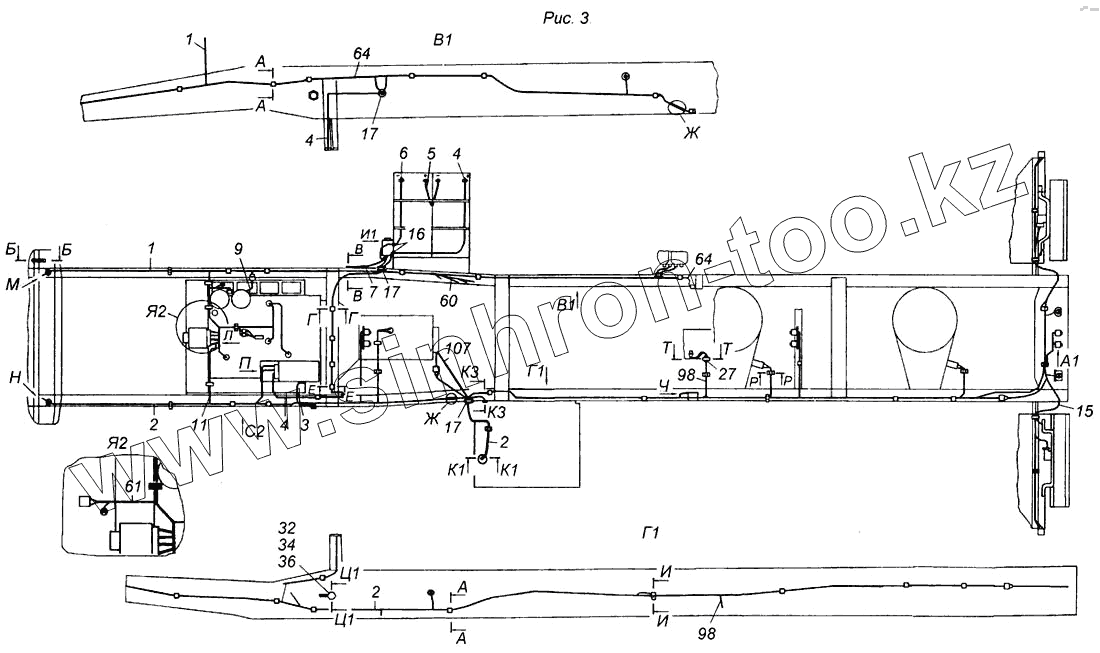 Каталог запасных частей к технике: Камский автозавод 6540. Установка проводов на шасси