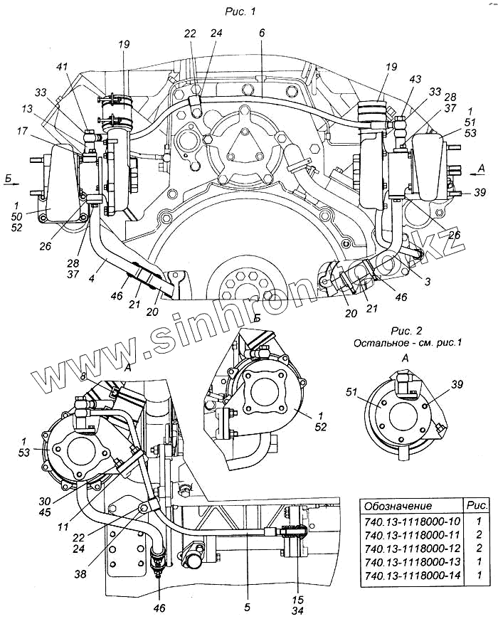 Каталог запасных частей к технике: Камский автозавод 6540. Установка турбокомпрессора на двигатель