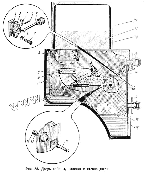 Каталог запасных частей к технике: КАЗ 608. Дверь кабины, навески и стекло двери