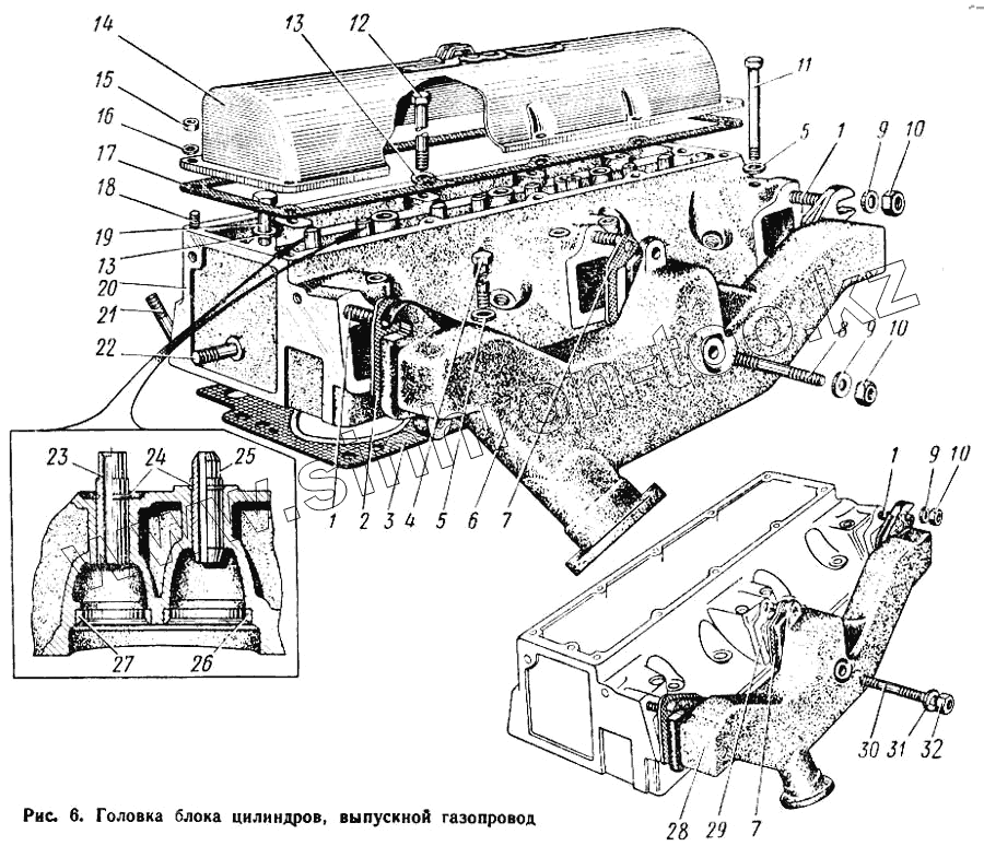 Каталог запасных частей к технике: КАЗ 608. Головка блока цилиндров, выпускной газопровод