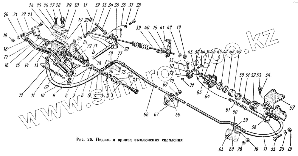 Каталог запасных частей к технике: КАЗ 608. Педаль и привод выключения сцепления