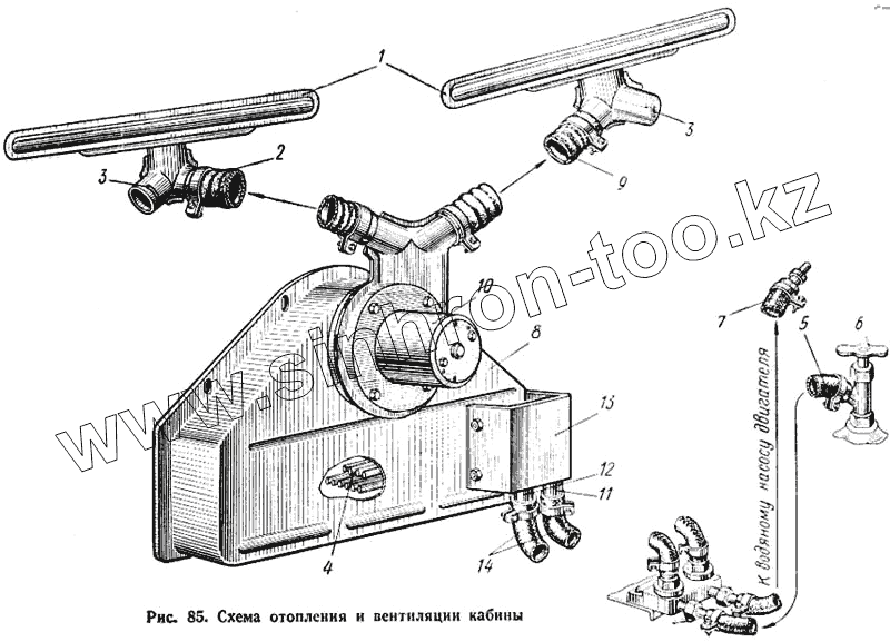 Каталог запасных частей к технике: КАЗ 608. Схема отопления и вентиляции кабины