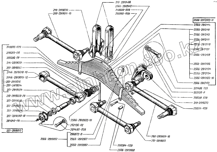 Каталог запасных частей к технике: КрАЗ-250. Рессоры задние и реактивные штанги