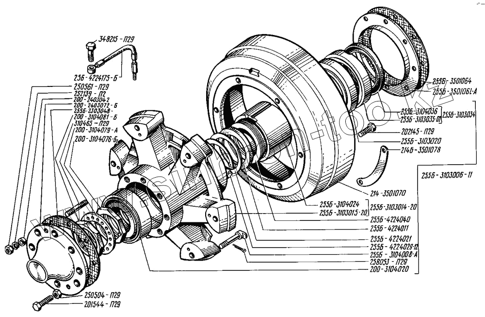 Каталог запасных частей к технике: КрАЗ-255. Ступицы передних колес и барабаны тормозные