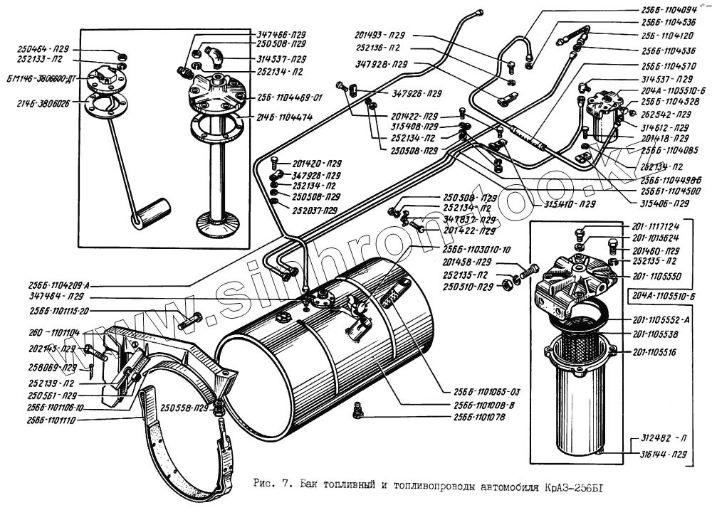 Каталог запасных частей к технике: КрАЗ-256. Бак топливный и топливопроводы автомобиля КрАЗ-256Б1
