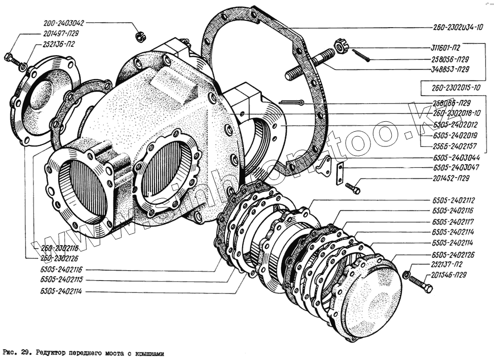 Каталог запасных частей к технике: КрАЗ-260. Редуктор переднего моста с крышками
