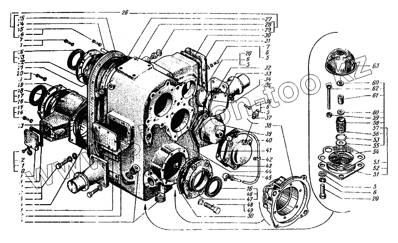 Каталог запасных частей к технике: КрАЗ-6443. Картеры и крышки раздаточной коробки