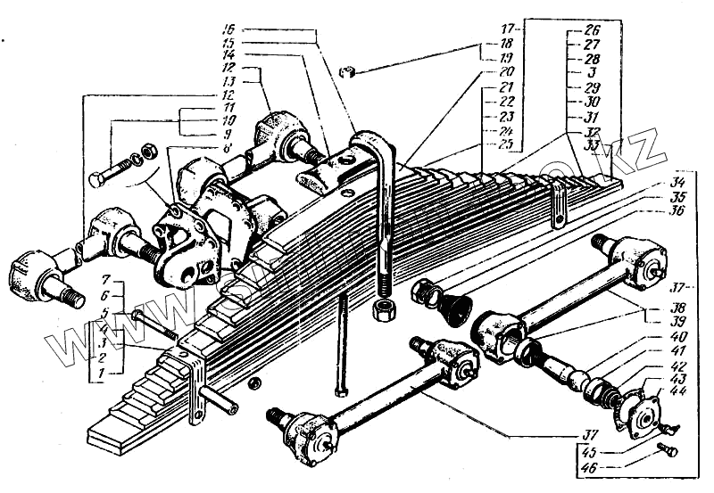 Каталог запасных частей к технике: КрАЗ-6443. Рессоры задние и реактивные штанги