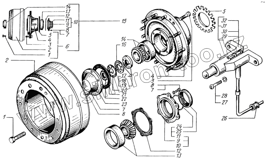 Каталог запасных частей к технике: КрАЗ-65055. Ступицы и тормозные барабаны передних колес