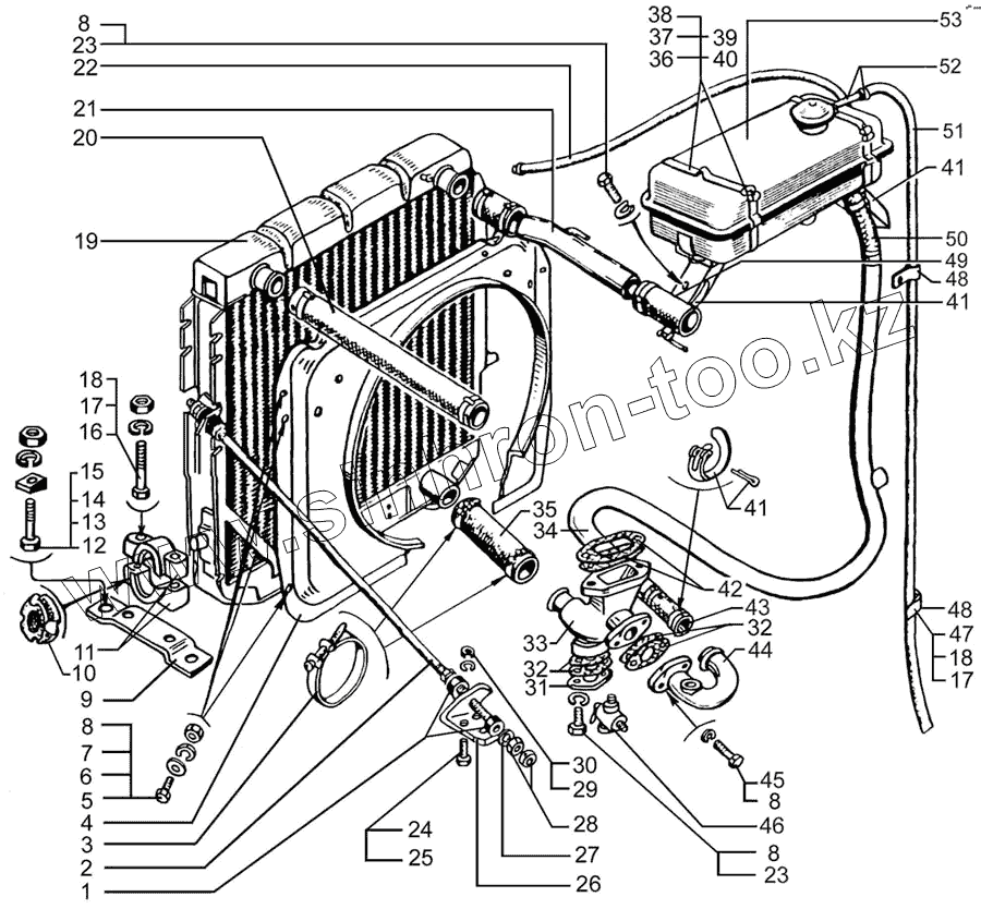 Каталог запасных частей к технике: КрАЗ-7133H4. Радиатор с кожухом и расширительным бачком
