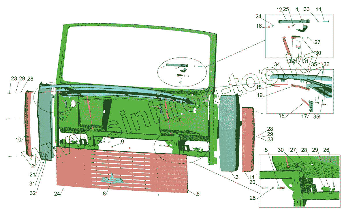 Каталог запасных частей к технике: МАЗ-437040 (Зубренок). Установка облицовки и боковых щитков