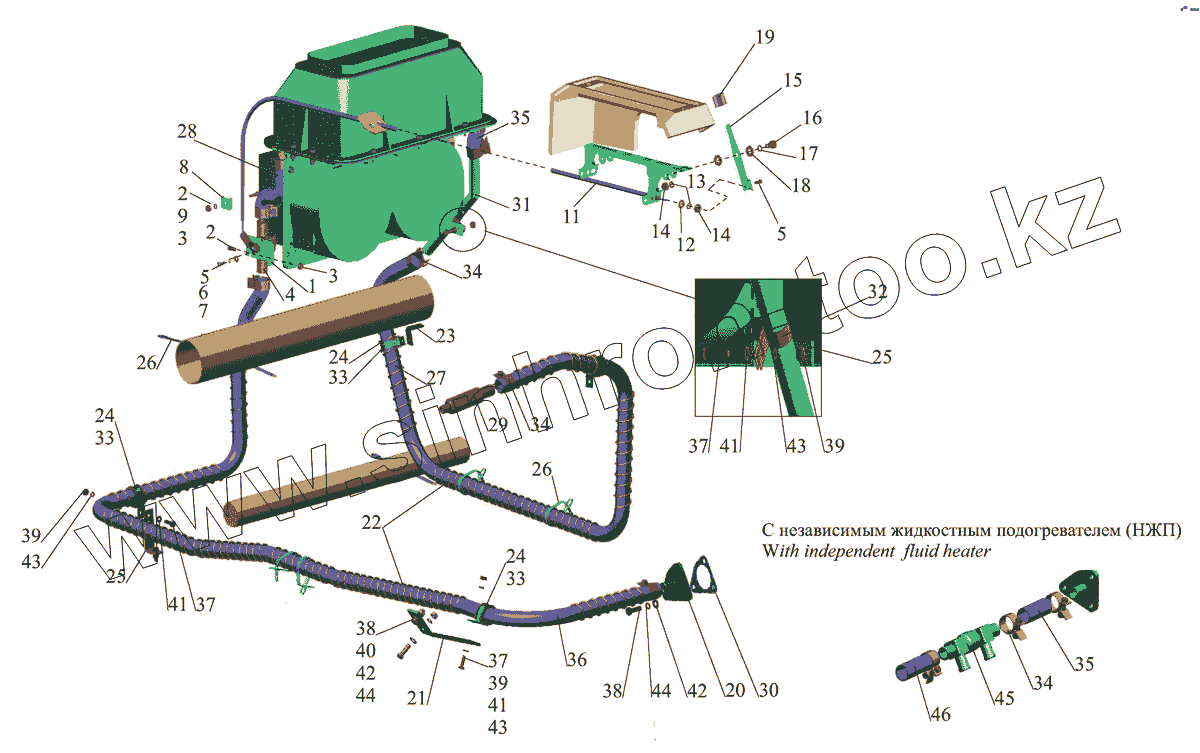 Каталог запасных частей к технике: МАЗ-437040 (Зубренок). Установка шлангов и крана управления отопителем