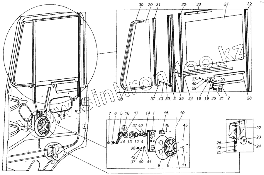 Каталог запасных частей к технике: МАЗ-437040 (Зубренок). Установка стеклоподъемника и ручки стеклоподъемника