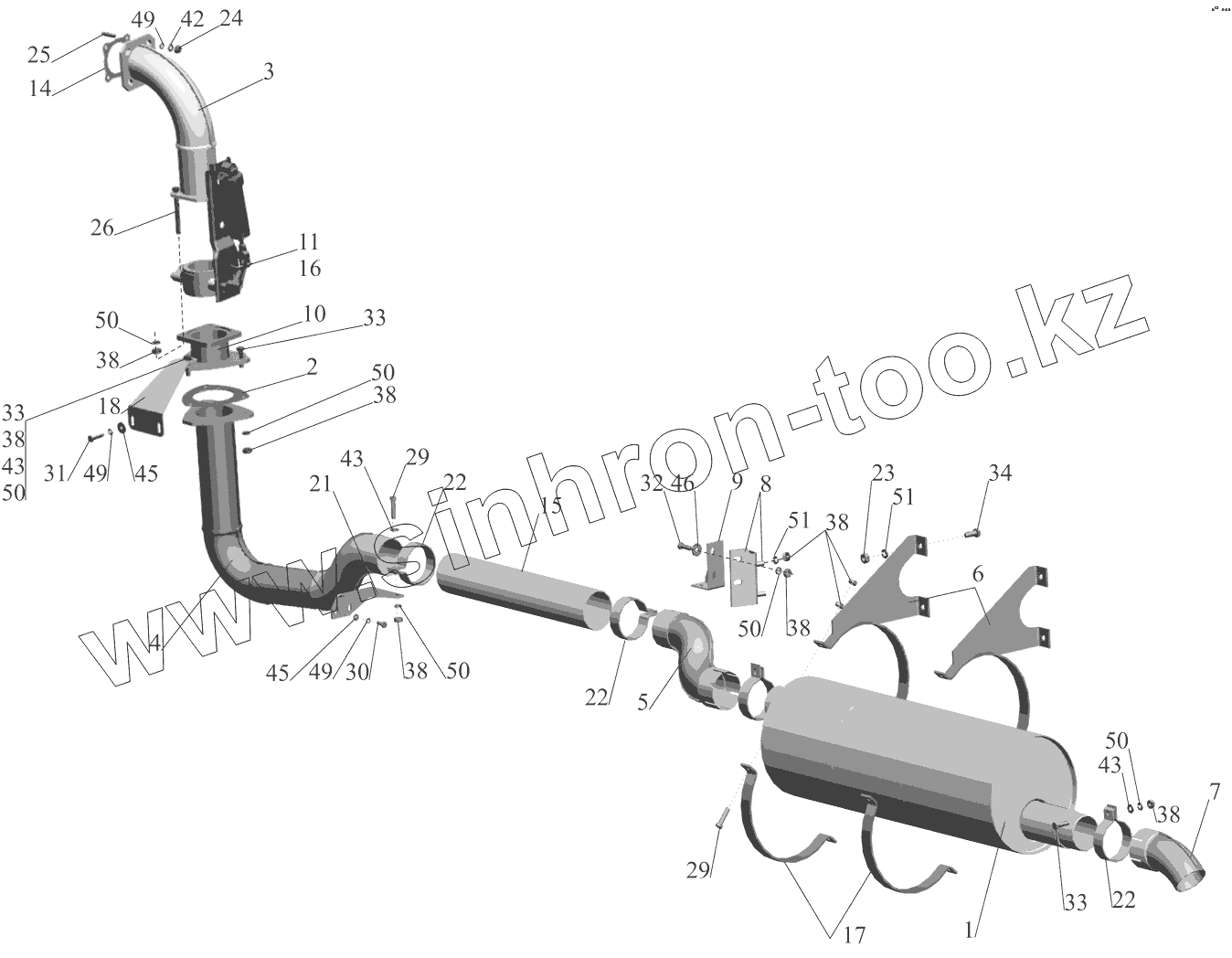 Каталог запасных частей к технике: МАЗ-437041 (Зубренок). Установка системы выпуска газов Р437041-1200001