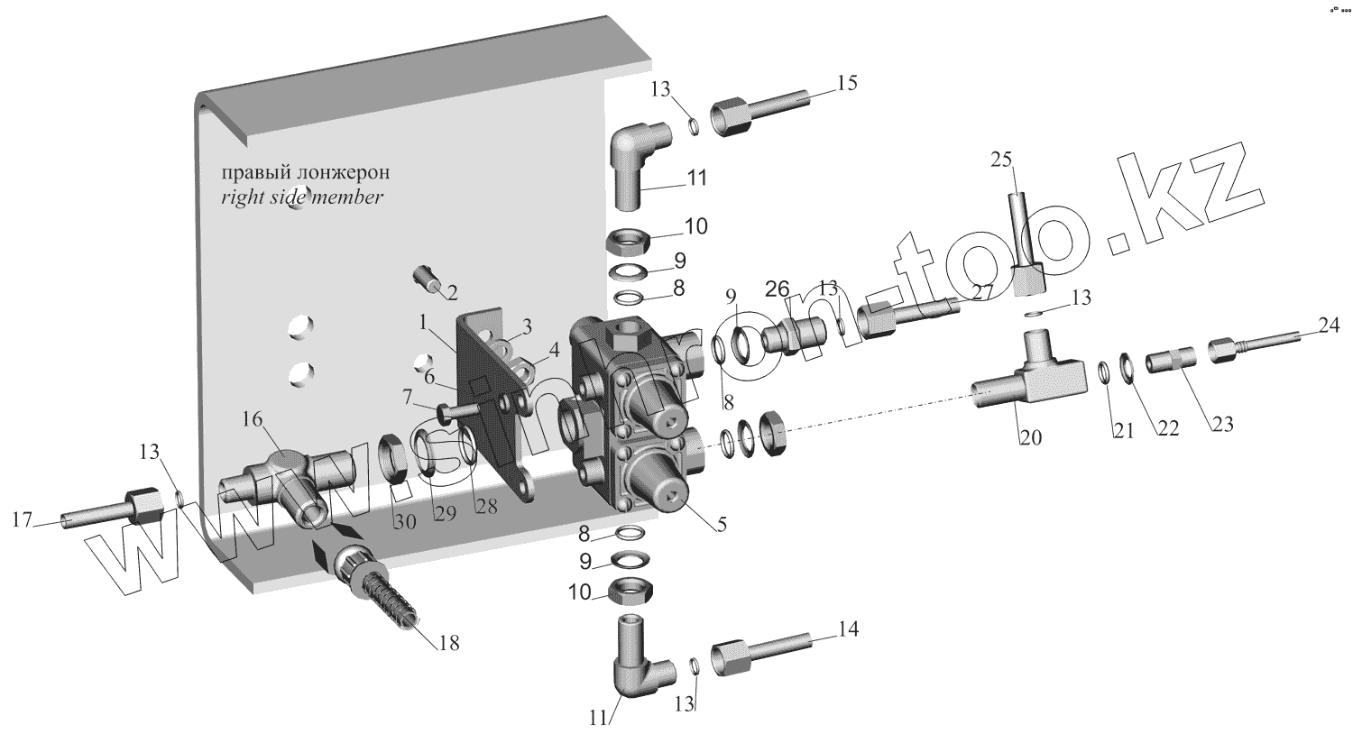 Каталог запасных частей к технике: МАЗ-437130 (Зубренок). Крепление четырехконтурного клапана 437030-3515002