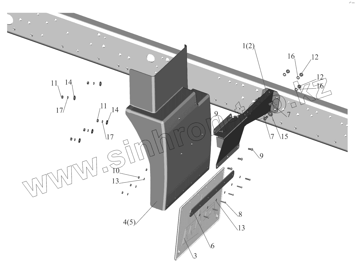 Каталог запасных частей к технике: МАЗ-437130 (Зубренок). Установка брызговиков передних колес 4371-8400030