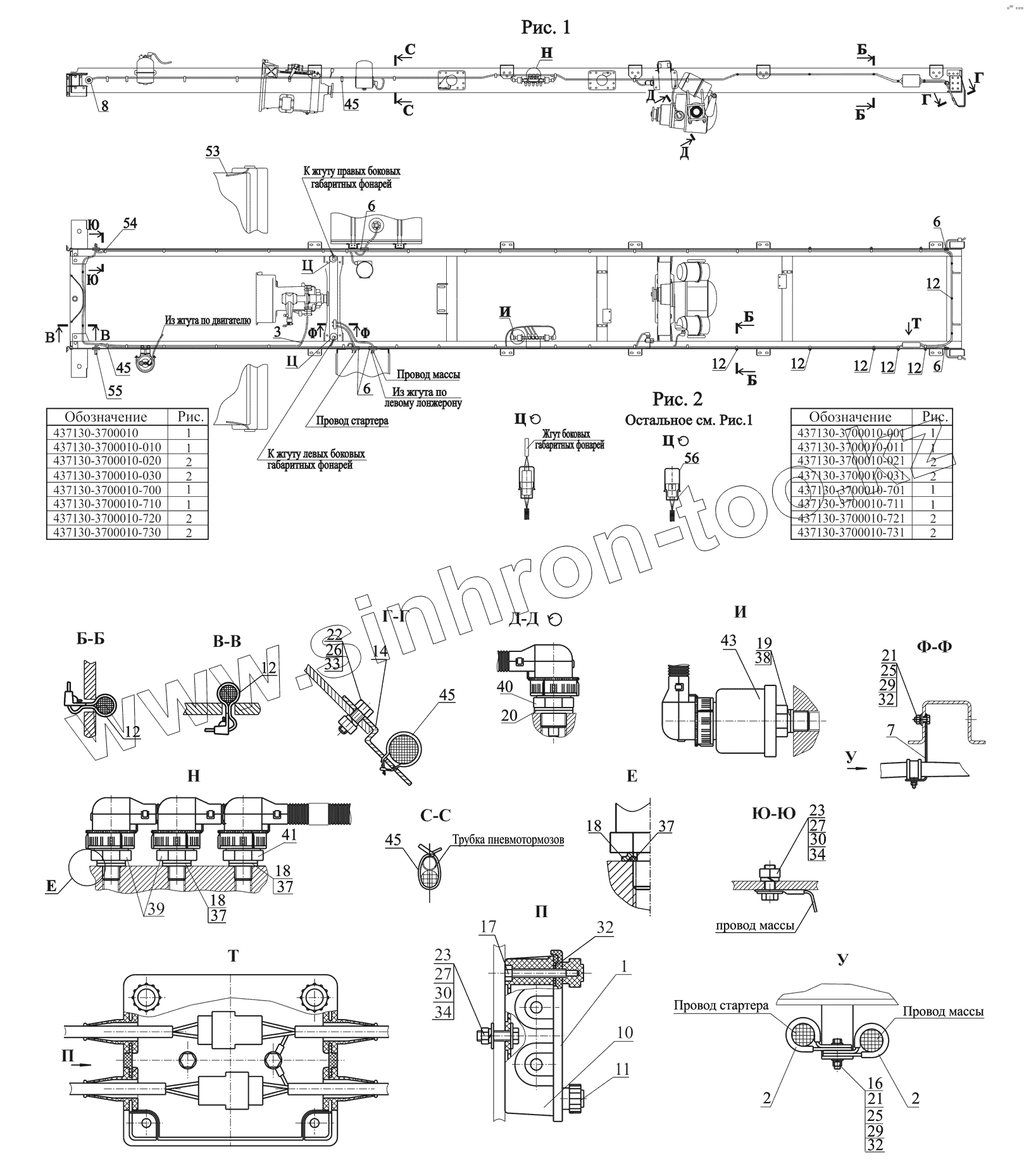 Каталог запасных частей к технике: МАЗ-437130 (Зубренок). Установка электрооборудования на шасси
