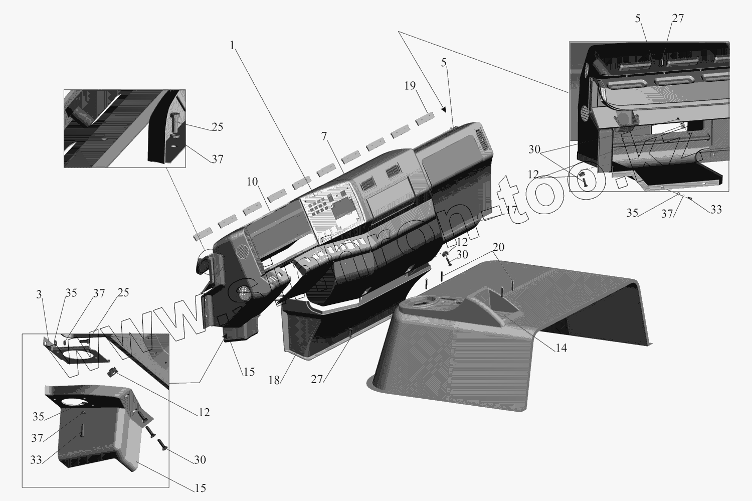 Каталог запасных частей к технике: МАЗ-437130 (Зубренок). Установка панели приборов 4371-5300014