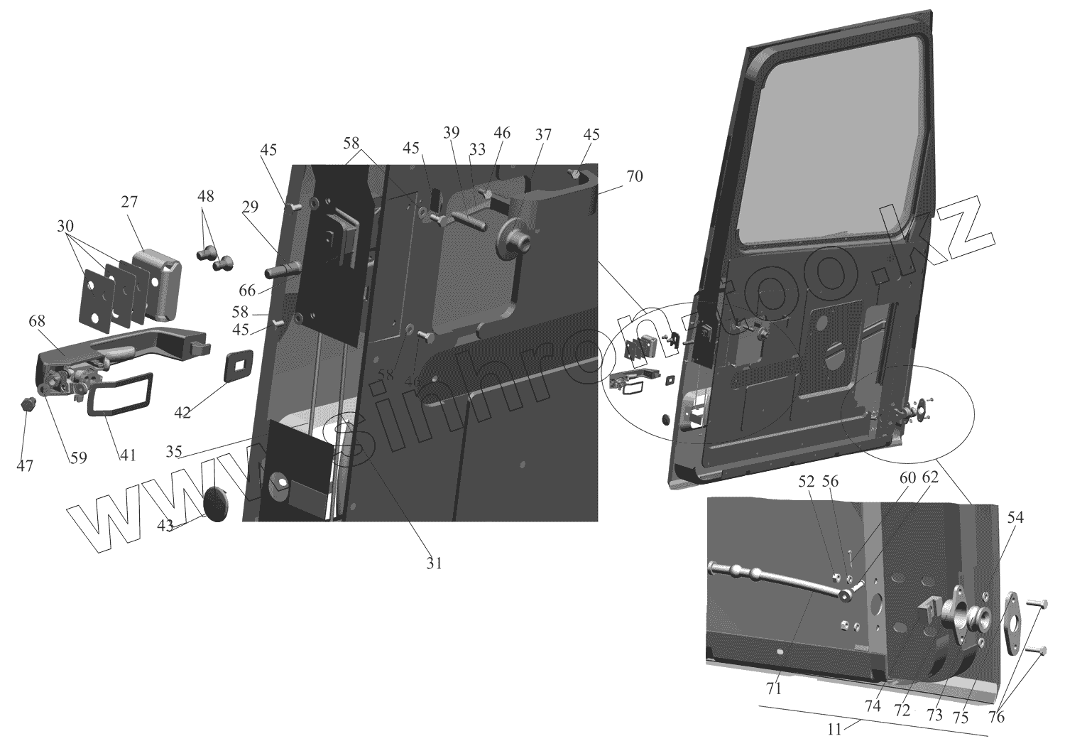 Каталог запасных частей к технике: МАЗ-437130 (Зубренок). Установка ручек, замка и ограничителя двери