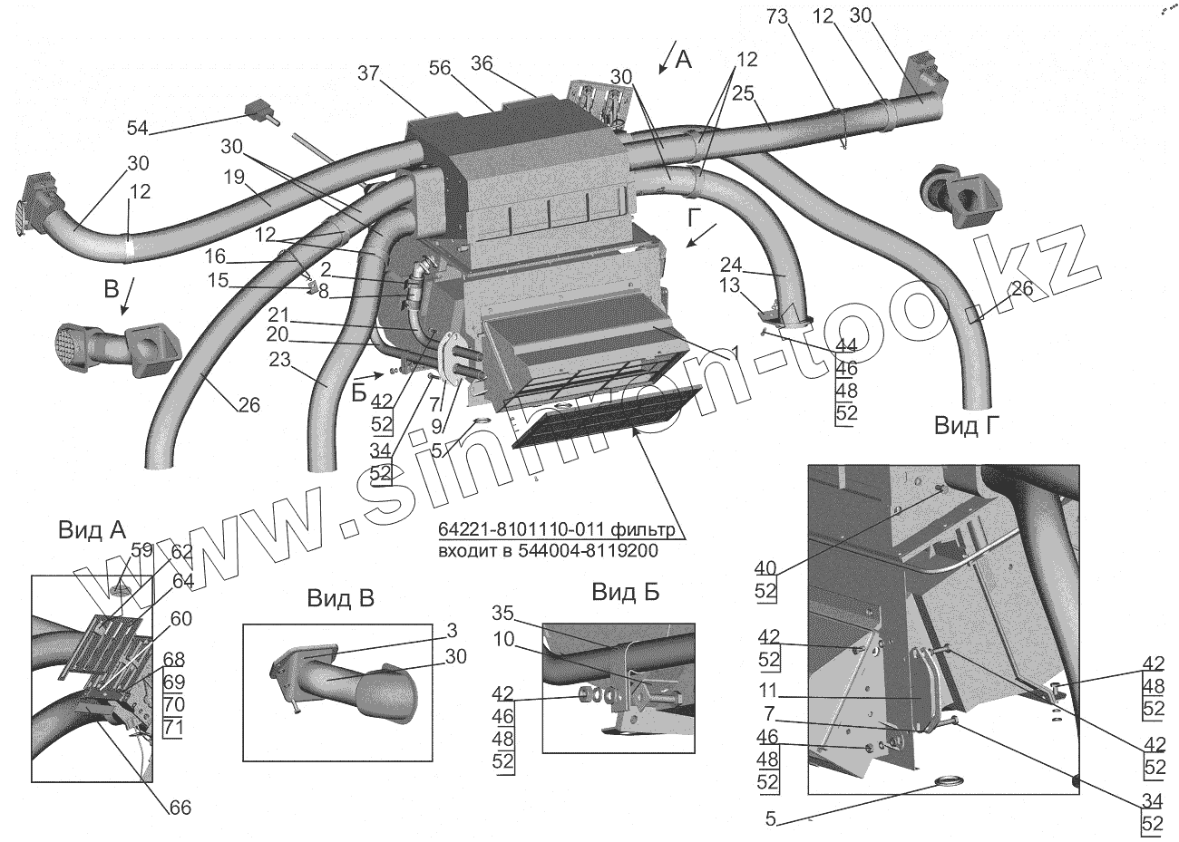 Каталог запасных частей к технике: МАЗ-4371P2-0000421-000. Установка отопителя 650118-8100001