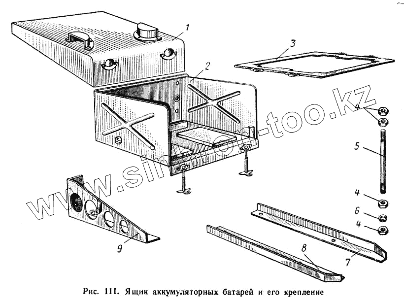 Каталог запасных частей к технике: МАЗ-500А. Ящик аккумуляторных батарей и его крепление