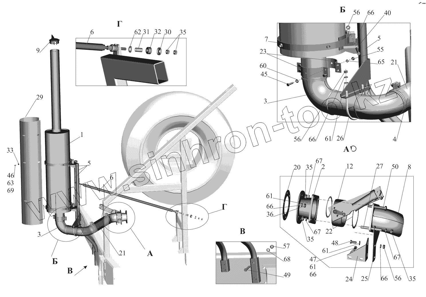 Каталог запасных частей к технике: МАЗ-530905. Установка системы выпуска газов 530905-1200001-030