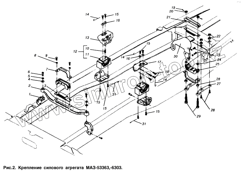 Каталог запасных частей к технике: МАЗ-53363. Крепление силового агрегата МАЗ-53363, МАЗ-6303