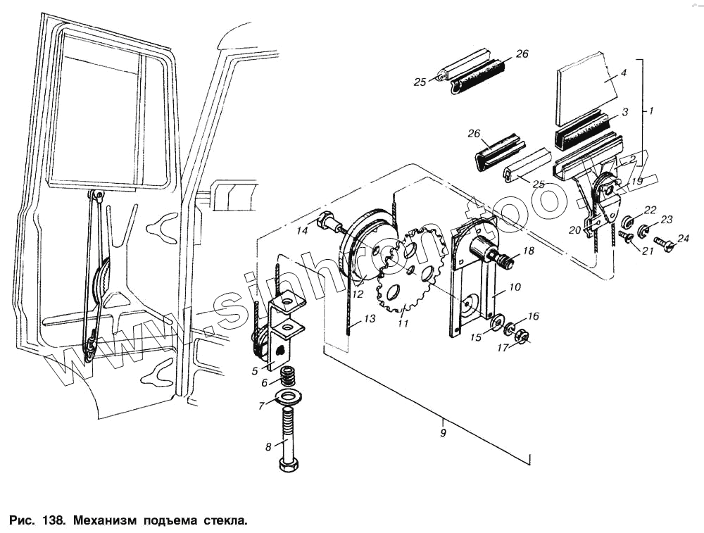 Каталог запасных частей к технике: МАЗ-53363. Механизм подъема стекла