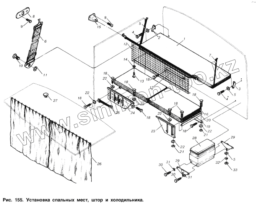Каталог запасных частей к технике: МАЗ-53366. Установка спальных мест, штор и холодильника