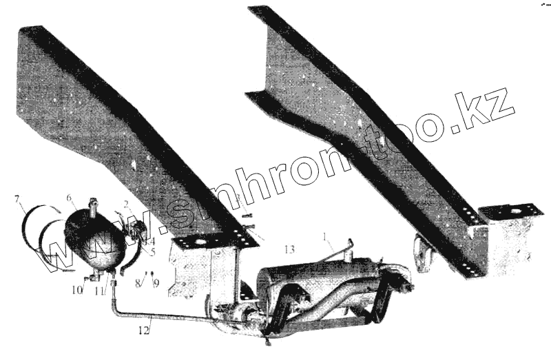 Установка ресивера и присоединительной арматуры на МАЗ-533608, МАЗ-533605, МАЗ-533603, МАЗ-533602 (лонжерон левый)