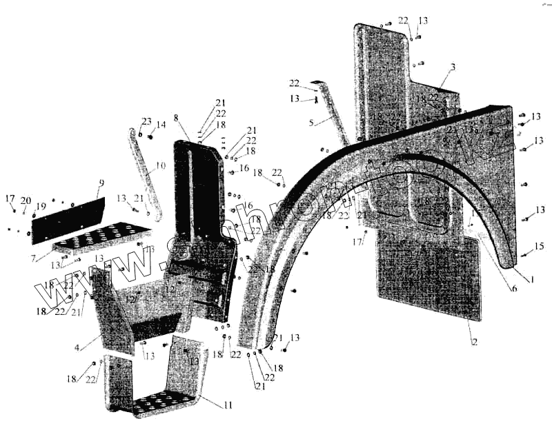 Каталог запасных частей к технике: МАЗ-5336. Установка оперения на большую кабину