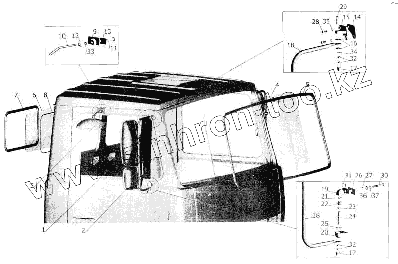 Каталог запасных частей к технике: МАЗ-5336. Установка стекол и зеркал на малую кабину