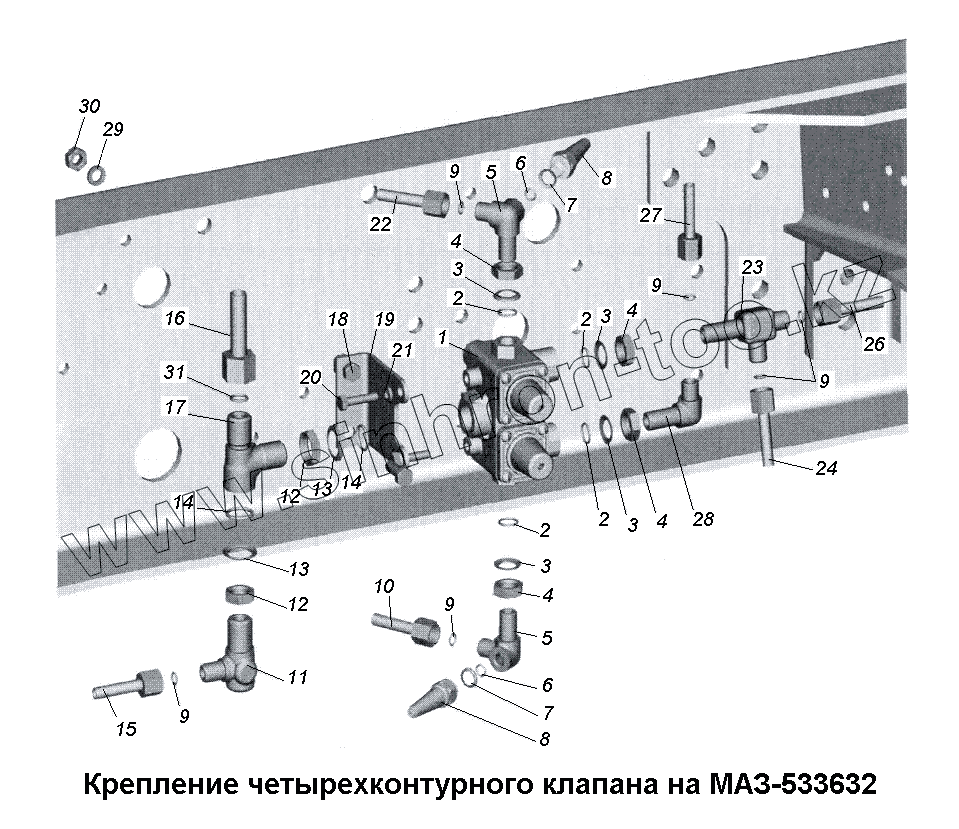 Каталог запасных частей к технике: МАЗ-533731. Крепление четырехконтурного клапана на МАЗ-533632