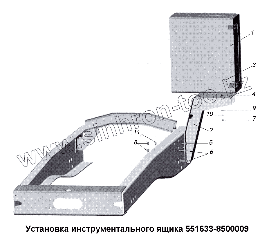 Каталог запасных частей к технике: МАЗ-533731. Установка инструментального ящика 551633-8500009