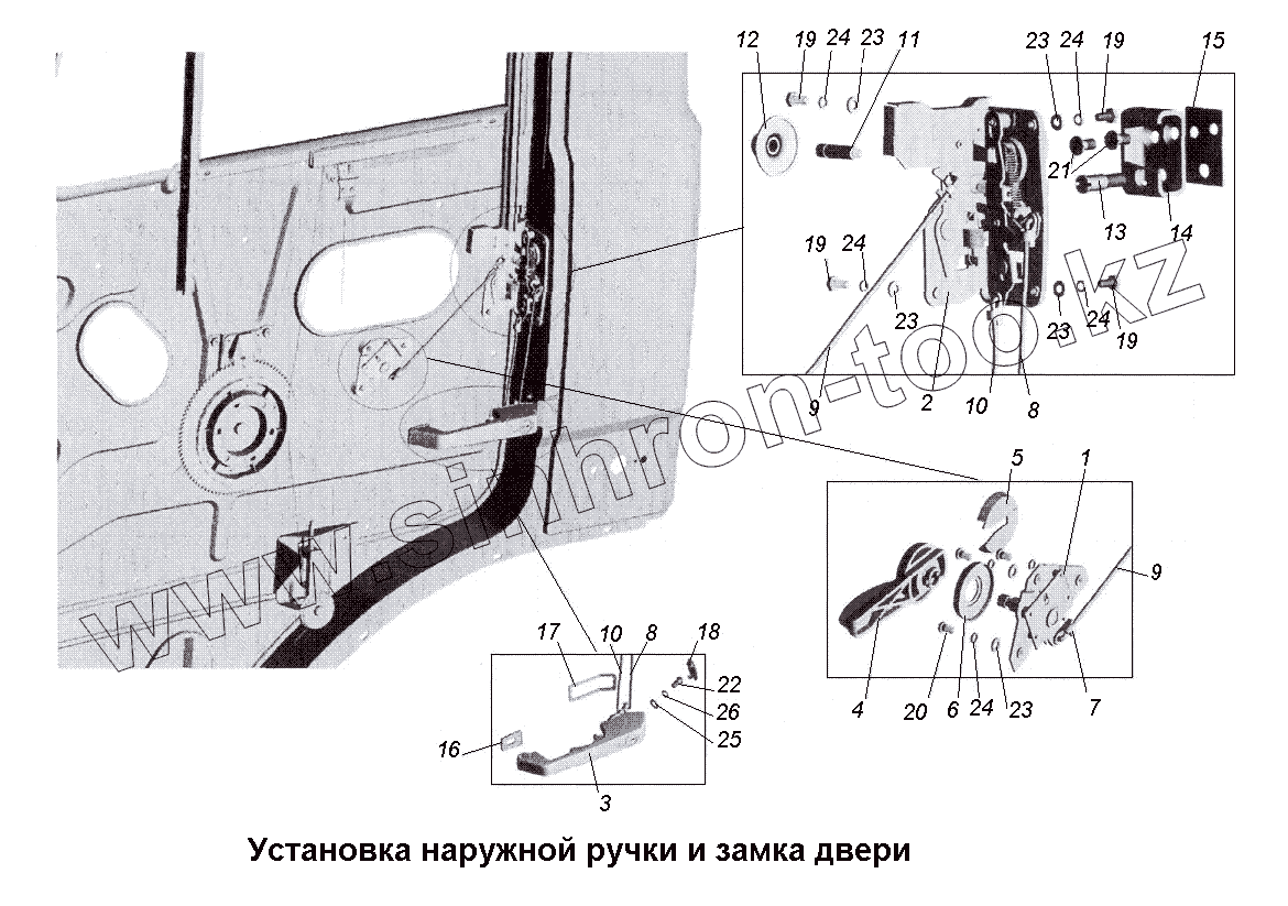 Каталог запасных частей к технике: МАЗ-533731. Установка наружной ручки и замка двери
