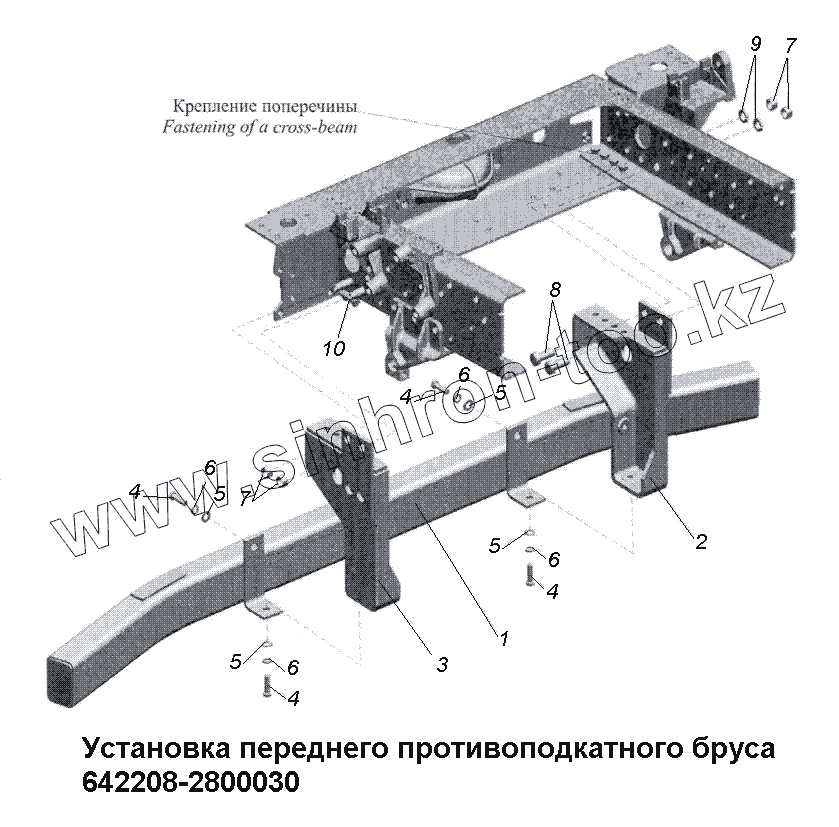 Каталог запасных частей к технике: МАЗ-533731. Установка переднего противоподкатного бруса 642208-2800030